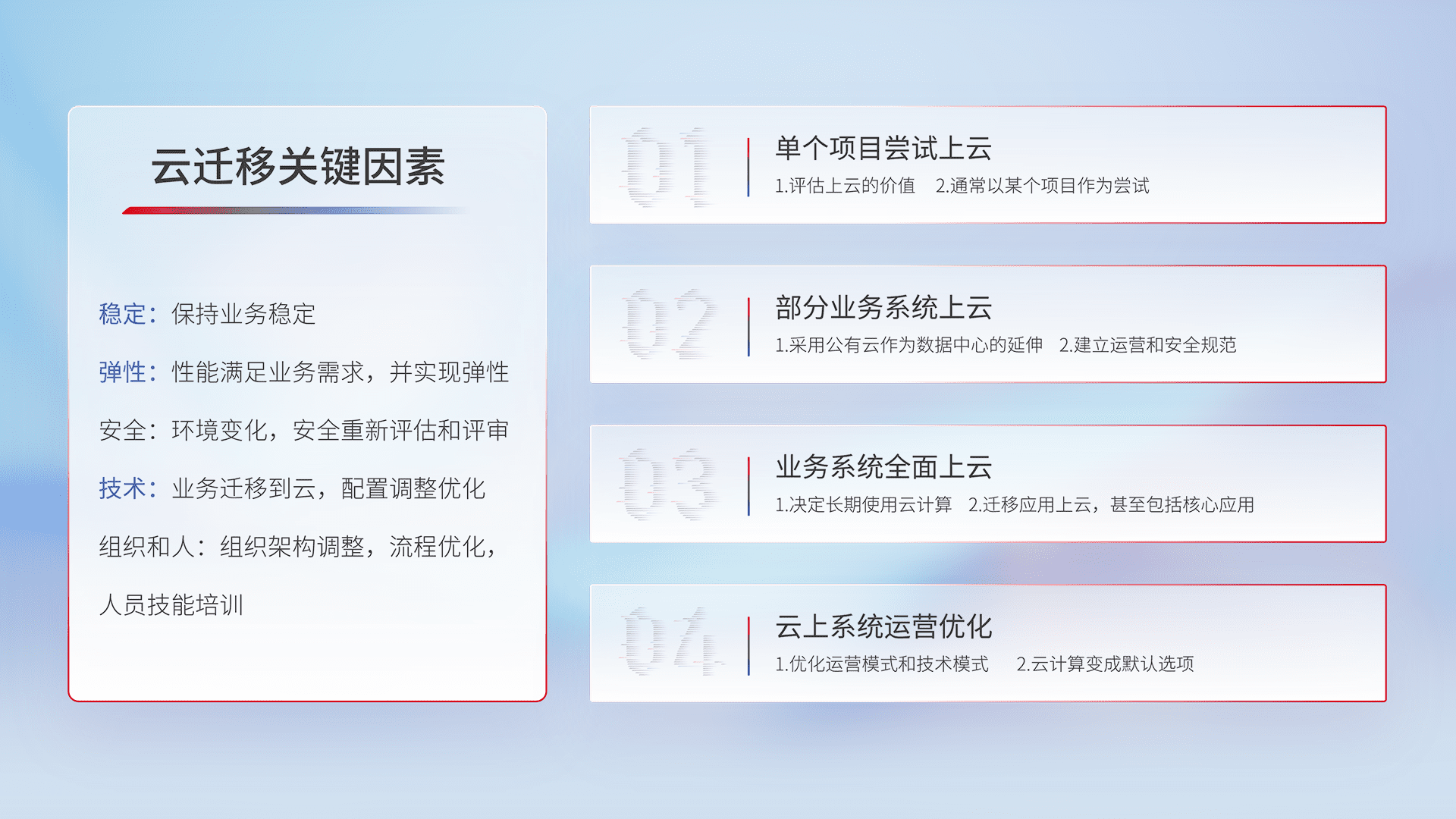 结合实际业务,,从规划设计、、云平台选型、、云原生改造、、、数据迁移、、、集成交付,,迁移全过程为客户识别最佳上云路径,,,,做好风险识别管理,,,,设计网络架构、、身份权限、、、、安全审计合规、、、、操作审计、、、、日志审计、、监控告警策略、、、多站点容灾设计等,,对云上基础设施进行整体规划,,,提升IT治理水平,,以满足弹性、、、、高可用、、、高性能的需求。。。